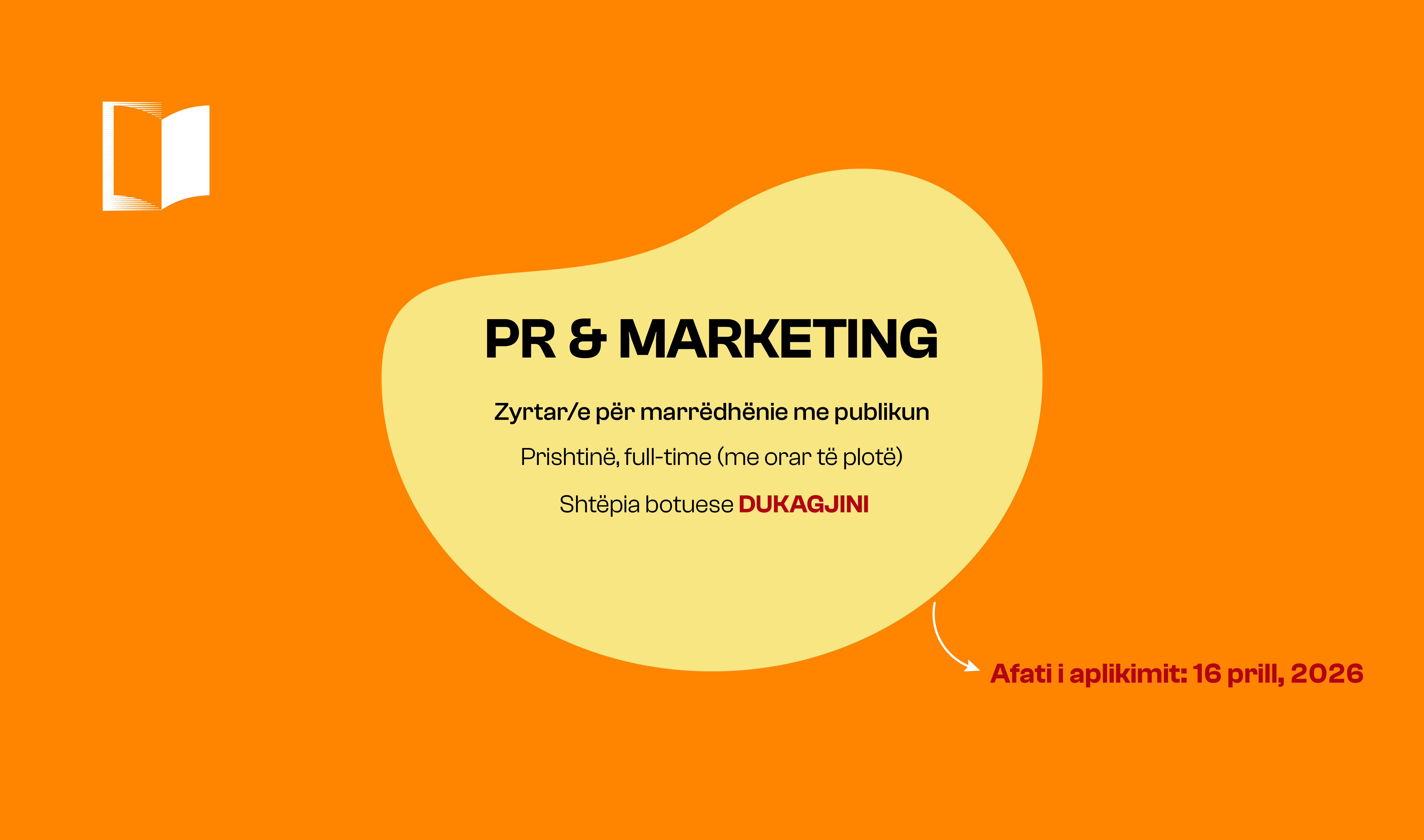 Po kërkojmë një zyrtar/e të marrëdhënieve me publikun që ka përvojë në këtë fushë, për t'iu bashkuar ekipit tonë dhe për të kontribuuar në promovimin e botimeve të shtëpisë botuese “Dukagjini” dhe imazhin e saj.